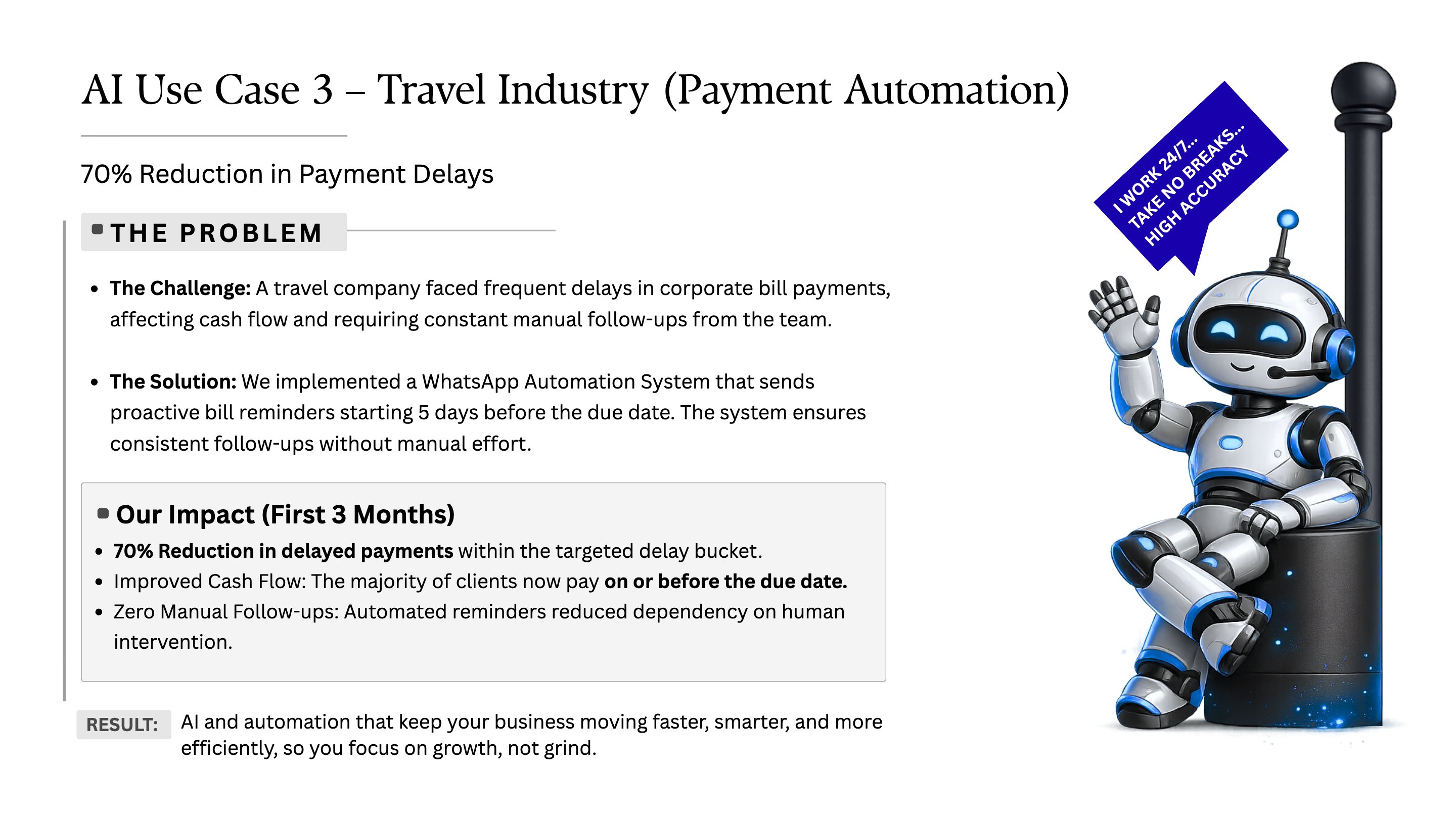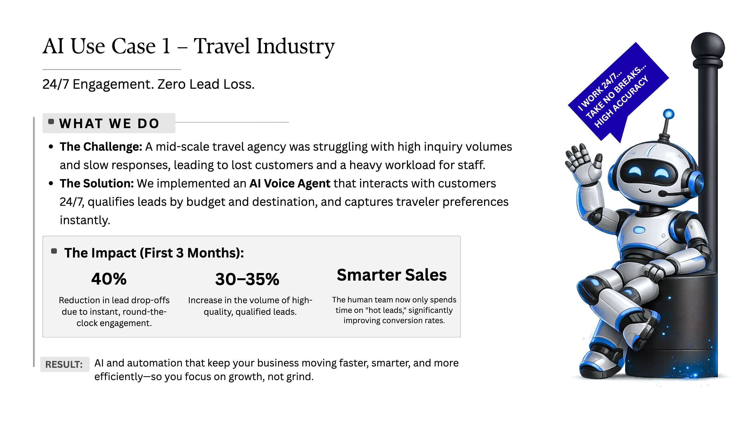 This presentation highlights Indiiserve.ai's capabilities in leveraging AI to streamline business processes. It details specific use cases, primarily within the travel industry and sales analytics, demonstrating how their solutions—such as AI voice agents, call analytics, and WhatsApp automation—reduce manual effort, improve lead qualification, and accelerate conversions.